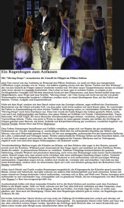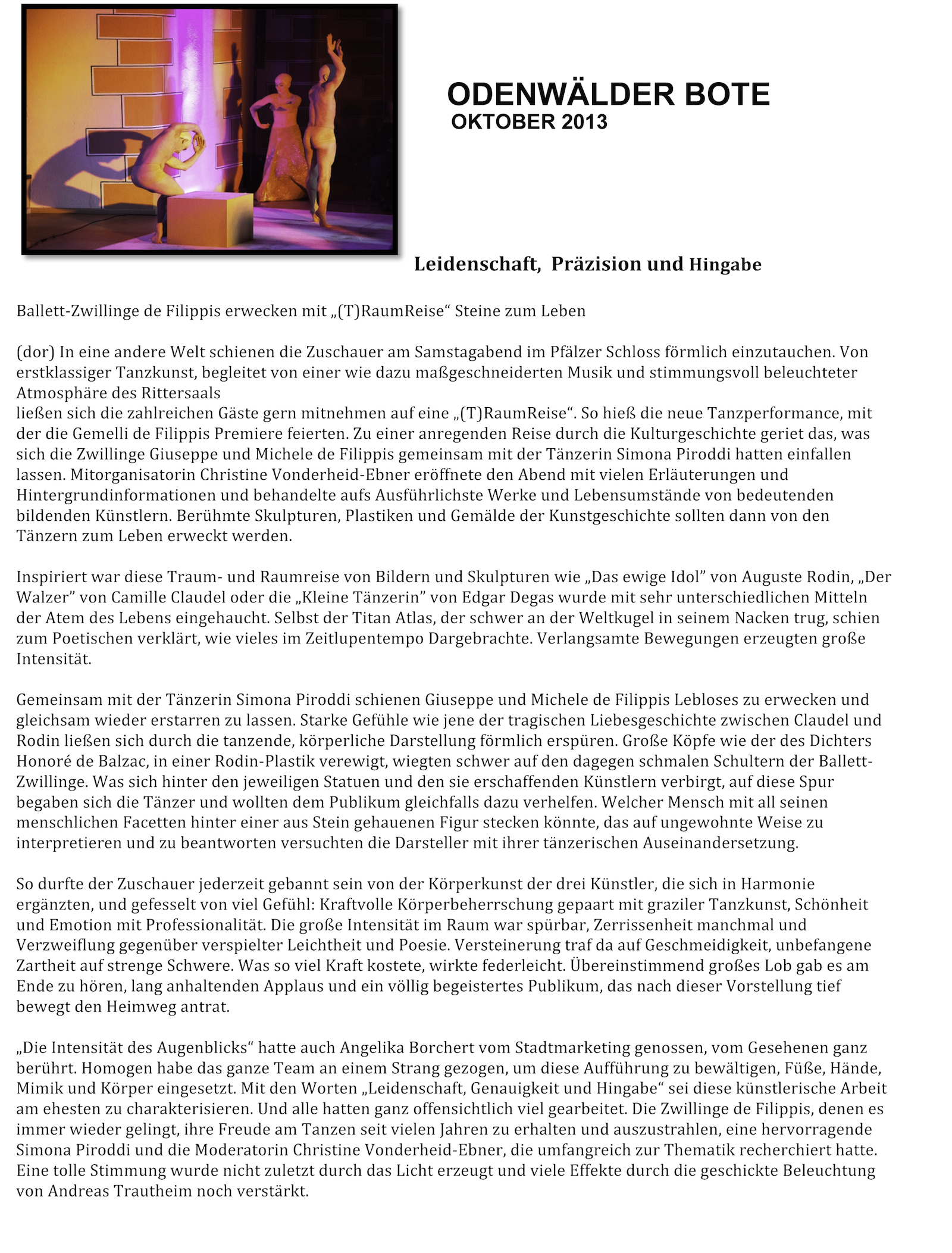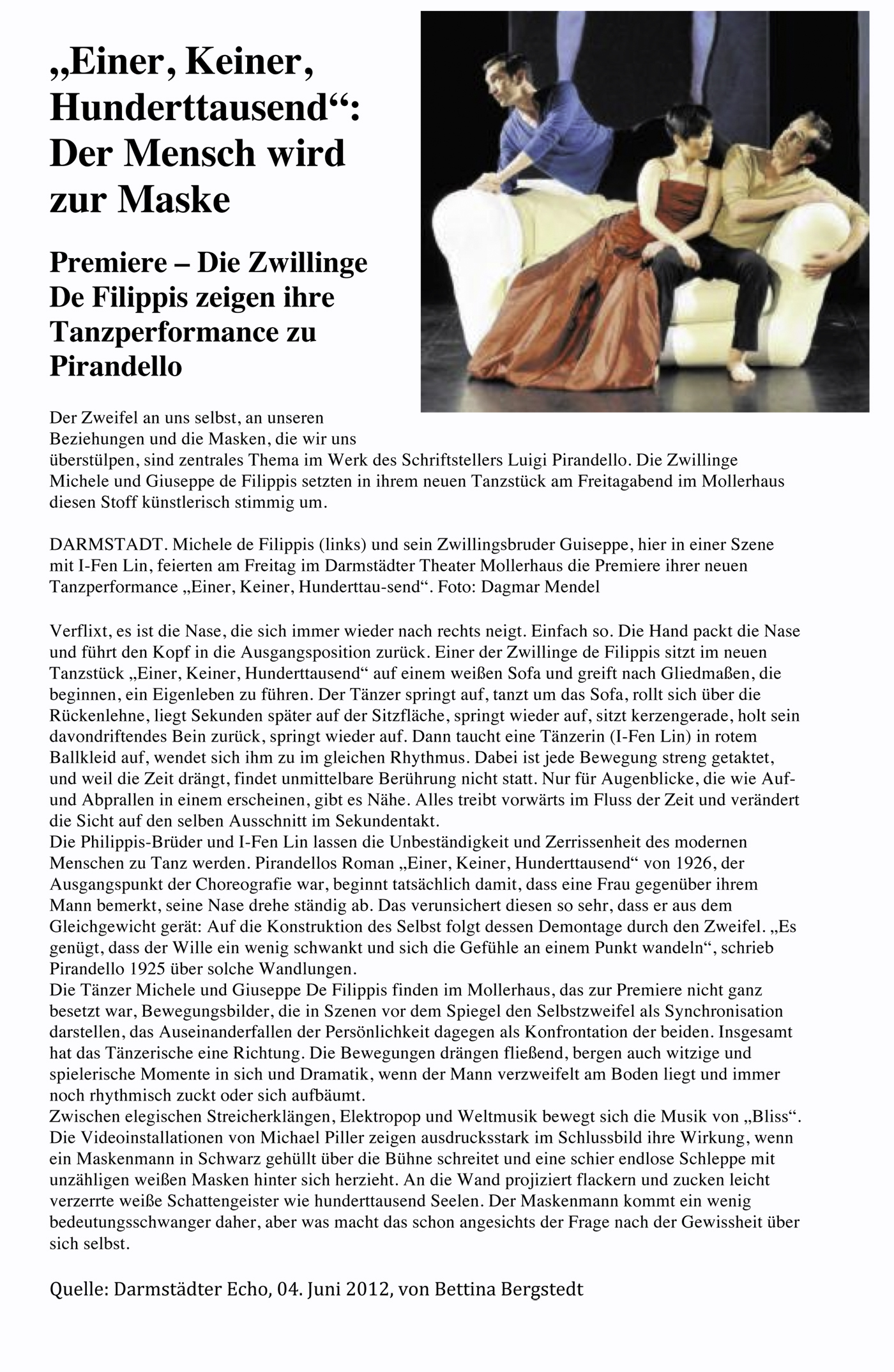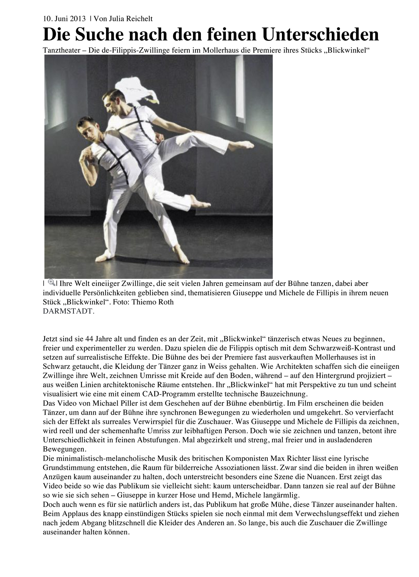 “Über das sehr ansehnliche unmittelbar tänzerische/ Choreographische hinaus haben die Filippis die Mittel der Licht und Video Projektion sinnfällig und unaufdringlich eingesetzt.”