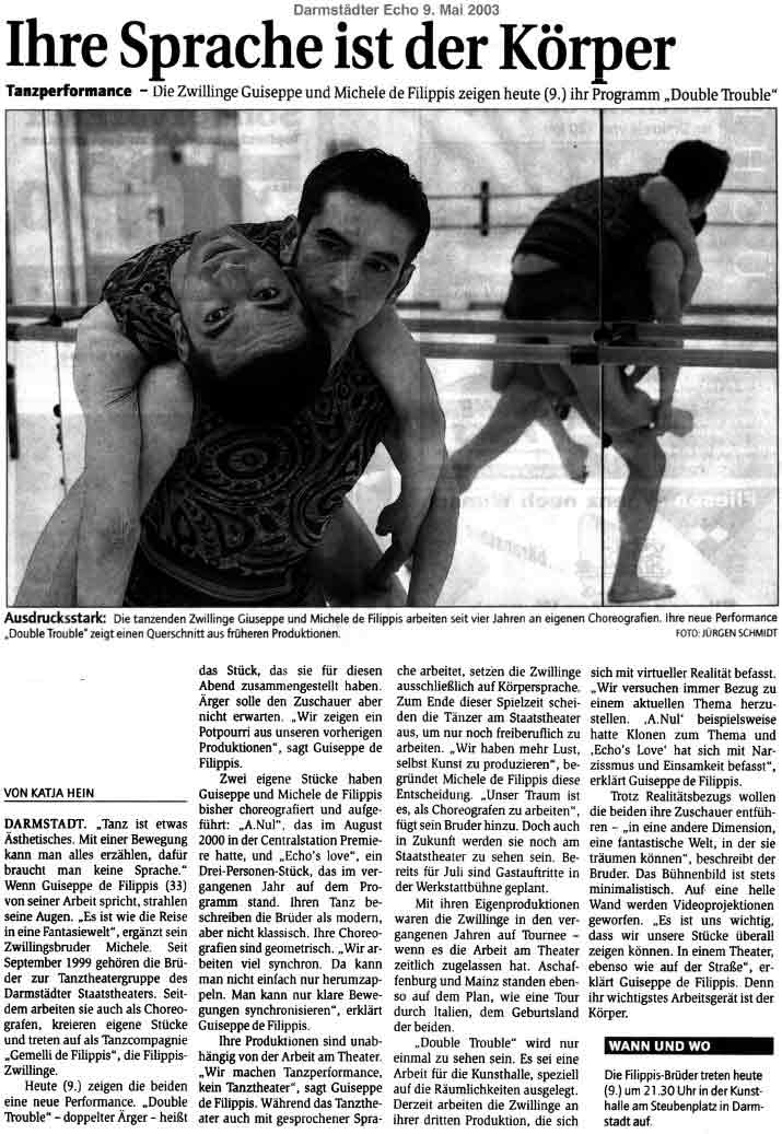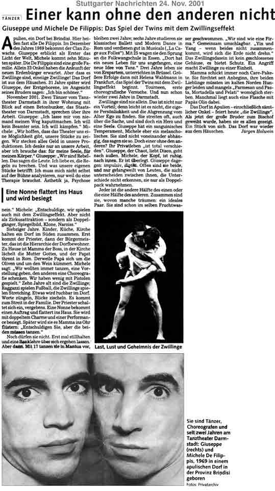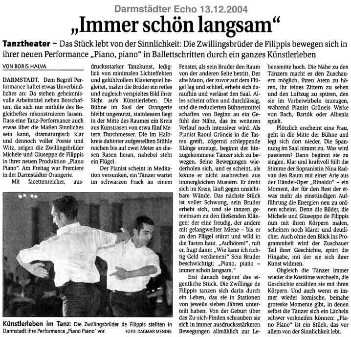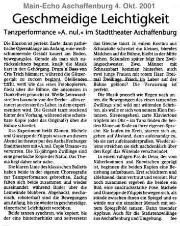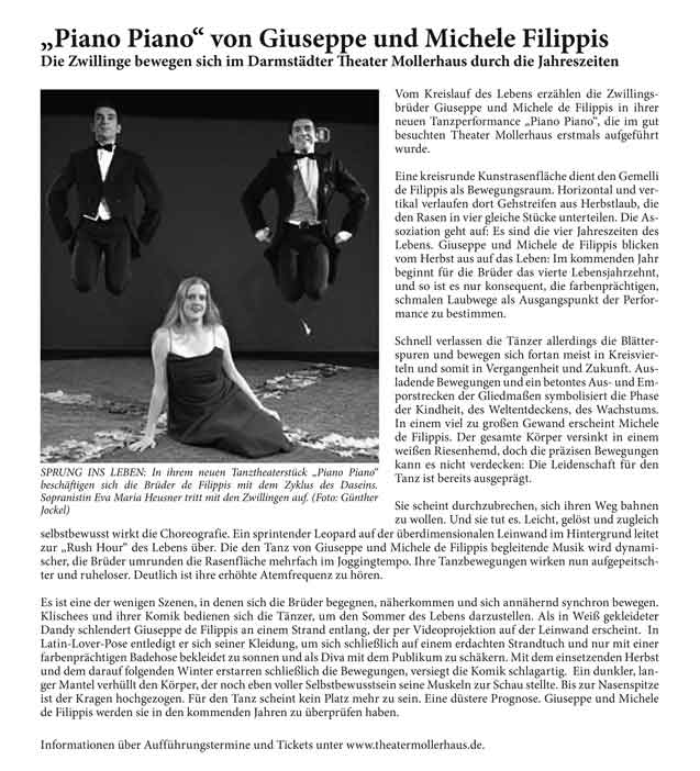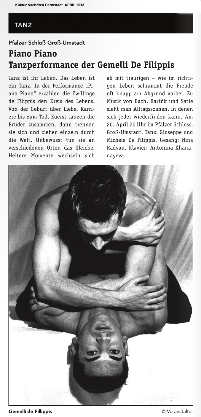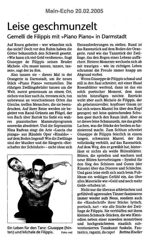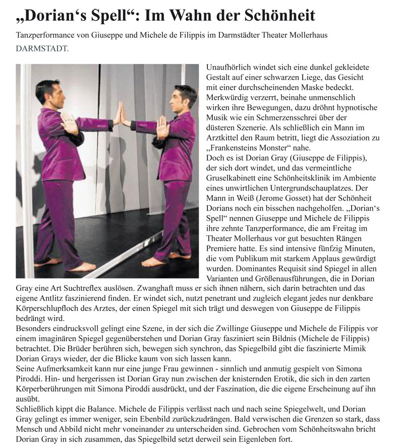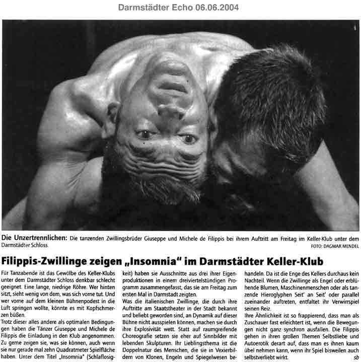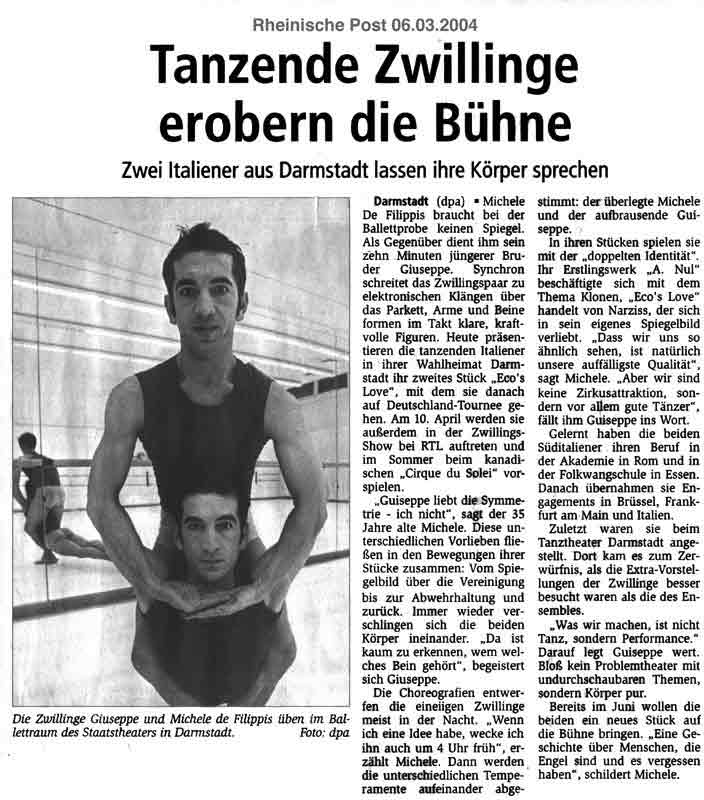 “Über das sehr ansehnliche unmittelbar tänzerische/ Choreographische hinaus haben die Filippis die Mittel der Licht und Video Projektion sinnfällig und unaufdringlich eingesetzt.”