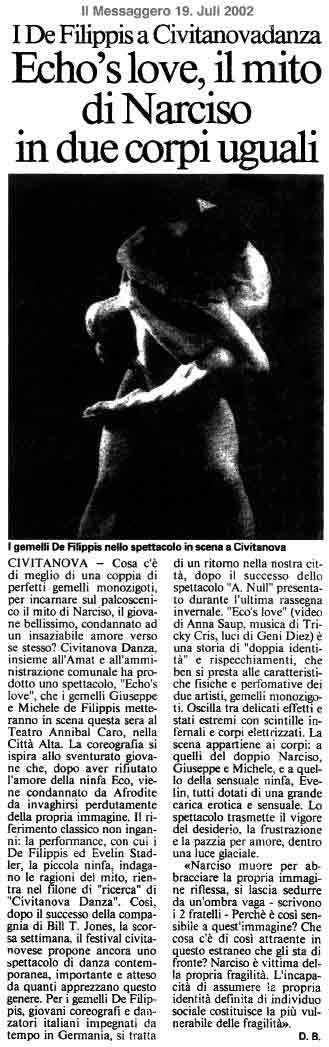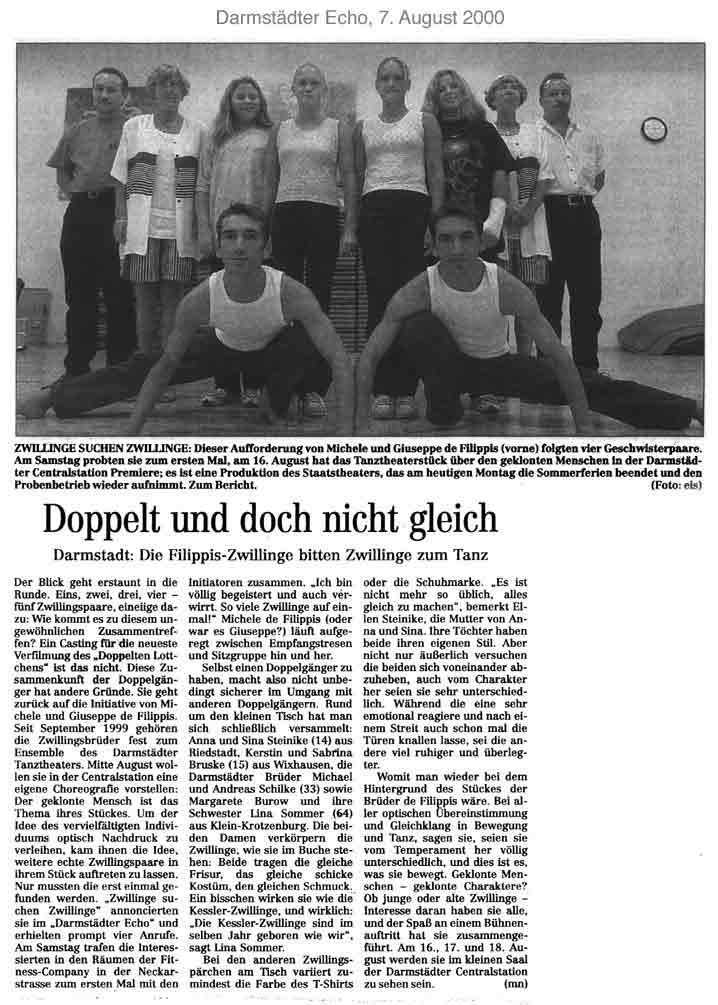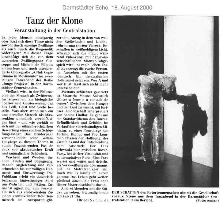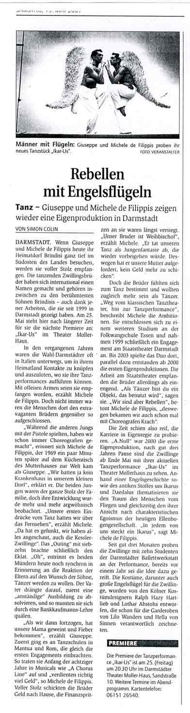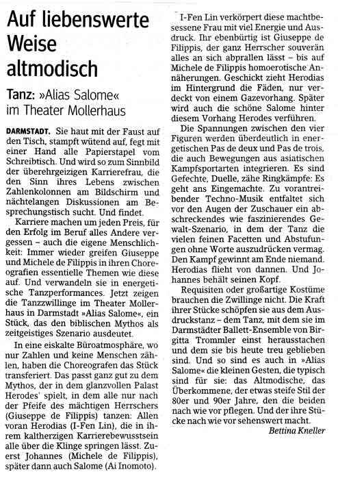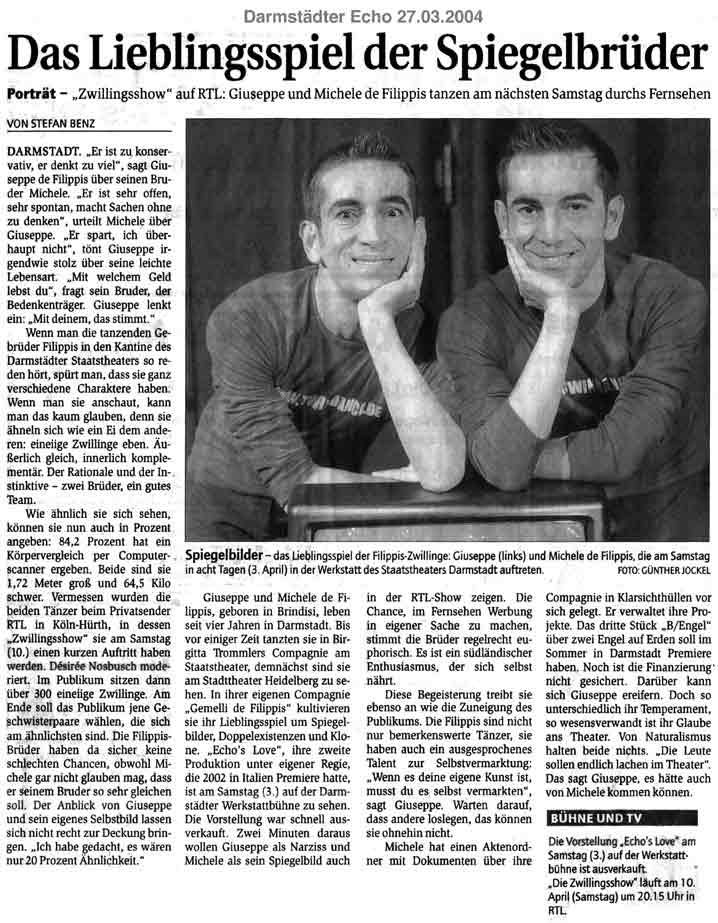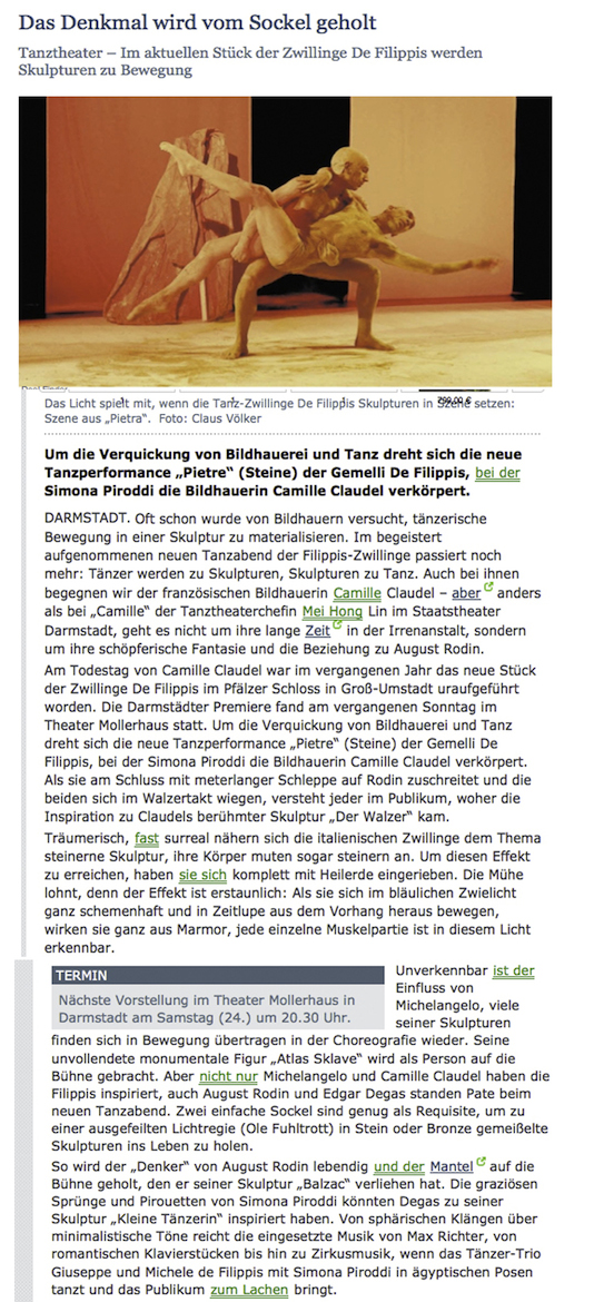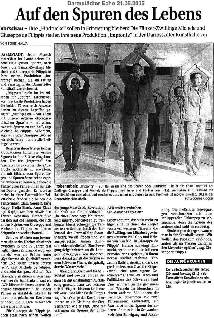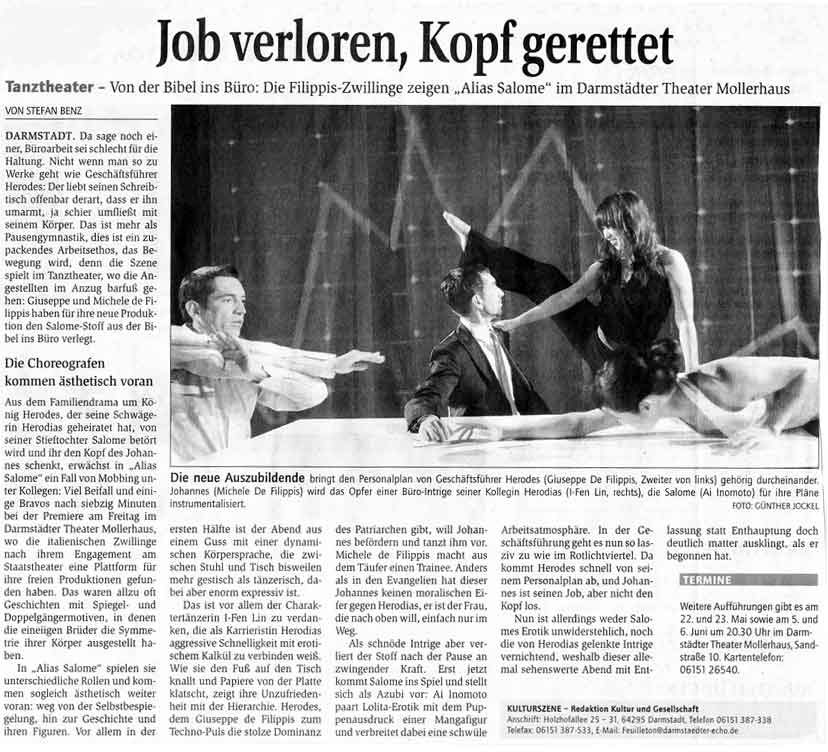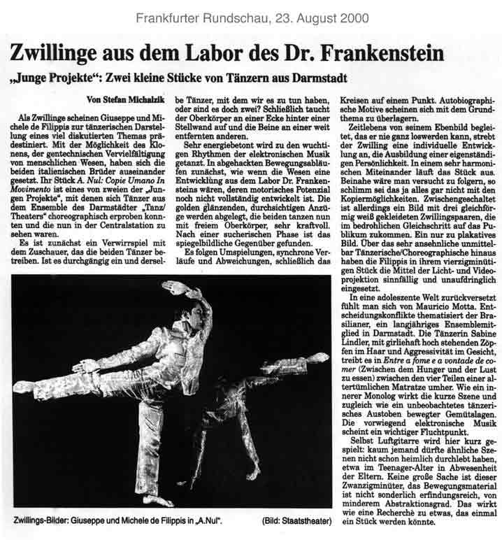 “Über das sehr ansehnliche unmittelbar tänzerische/ Choreographische hinaus haben die Filippis die Mittel der Licht und Video Projektion sinnfällig und unaufdringlich eingesetzt.”