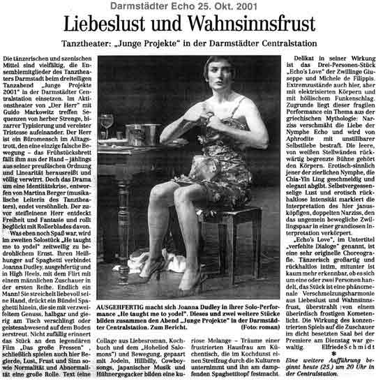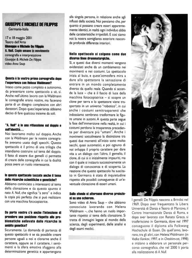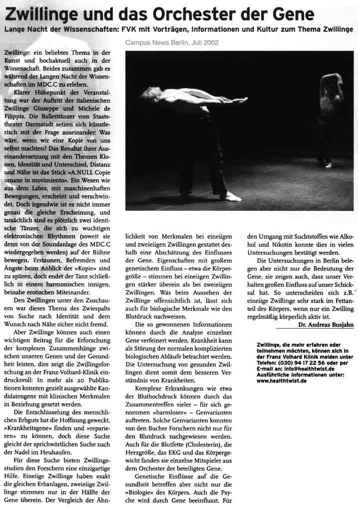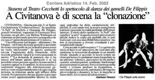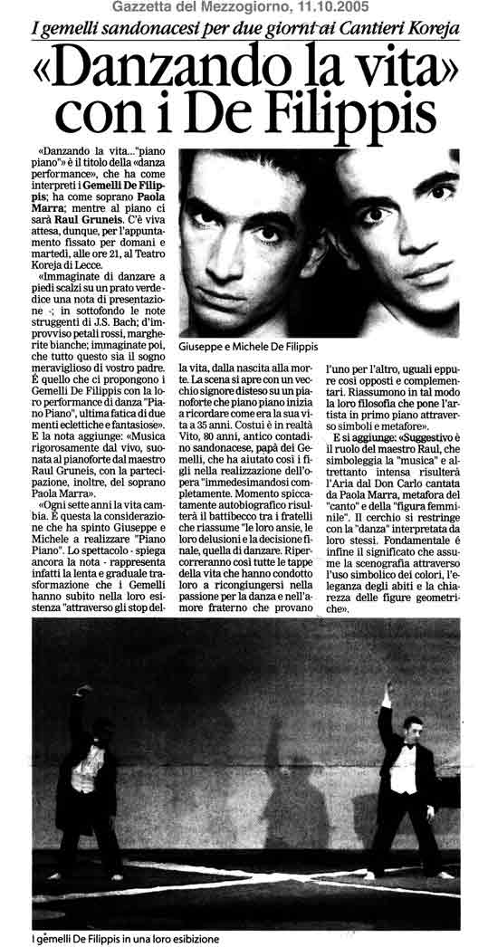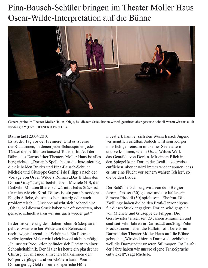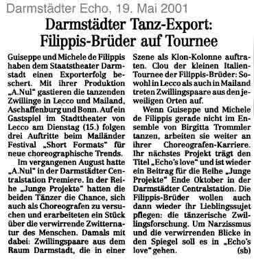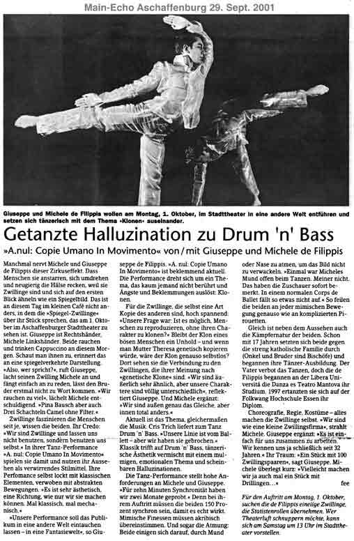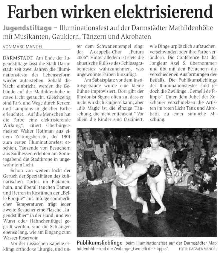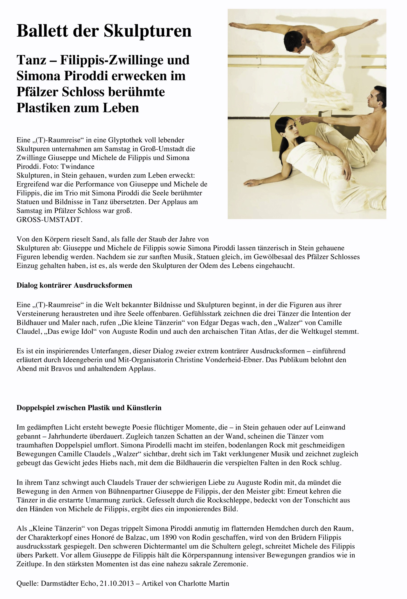 “Über das sehr ansehnliche unmittelbar tänzerische/ Choreographische hinaus haben die Filippis die Mittel der Licht und Video Projektion sinnfällig und unaufdringlich eingesetzt.”